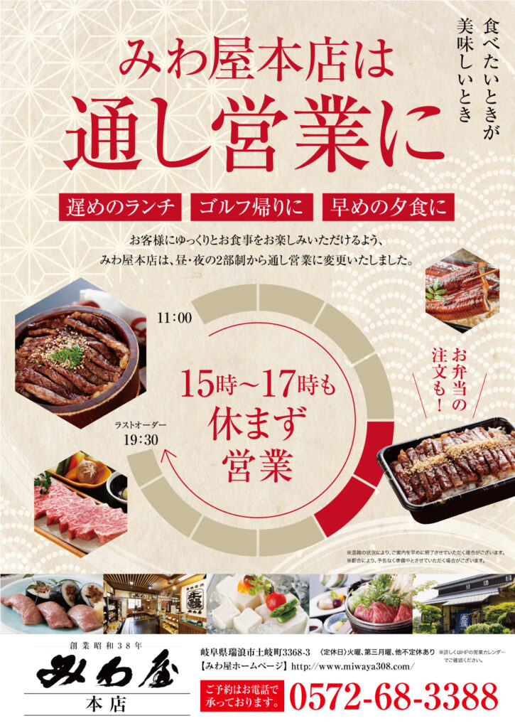 この度みわ屋本店は、昼・夜の2部制を廃止し、通しの営業となりました。より多くのお客様のご要望にお応えできるよう努めていきますので、今後ともご愛顧のほどよろしくお願い致します。
